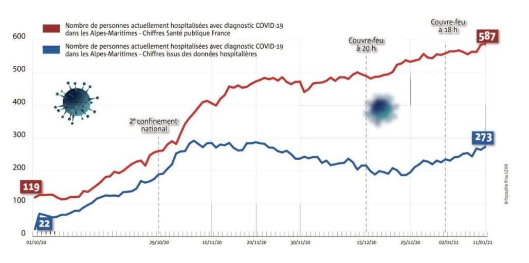Comme on le voit, selon les Alpes Maritimes comptaient, le 11 janvier, 273 personnes hospitalisées. Mais Santé Publique France en recensait 587… soit 2,5 fois plus environ.