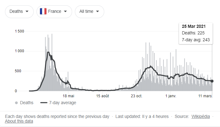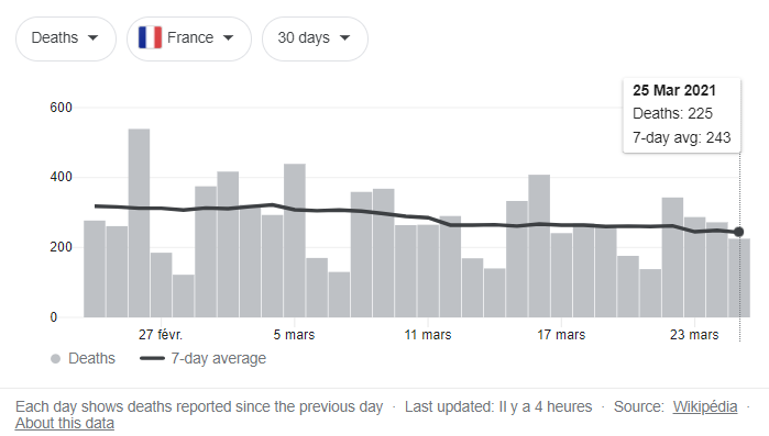 Comme on le voit, le mois de mars a prolongé la tendance apparue en février d’une baisse constante du nombre de décès quotidiens. Alors que ce nombre était supérieur à 300 au 1er mars, il n’est plus que de 243 à la fin du mois.