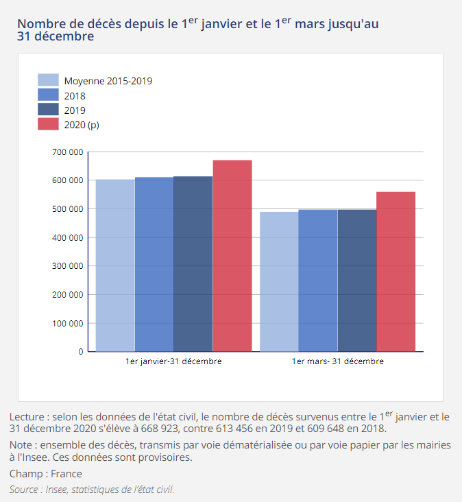 Les raisons pour lesquelles les statistiques « officielles » (celles du ministère de la Santé, pas celles de l’état-civil) dramatisent la situation sont bien connues. Le ministère de a Santé a fait le choix de compter parmi les morts du COVID tous ceux qui ne sont pas morts du COVID mais qui en étaient les porteurs.
