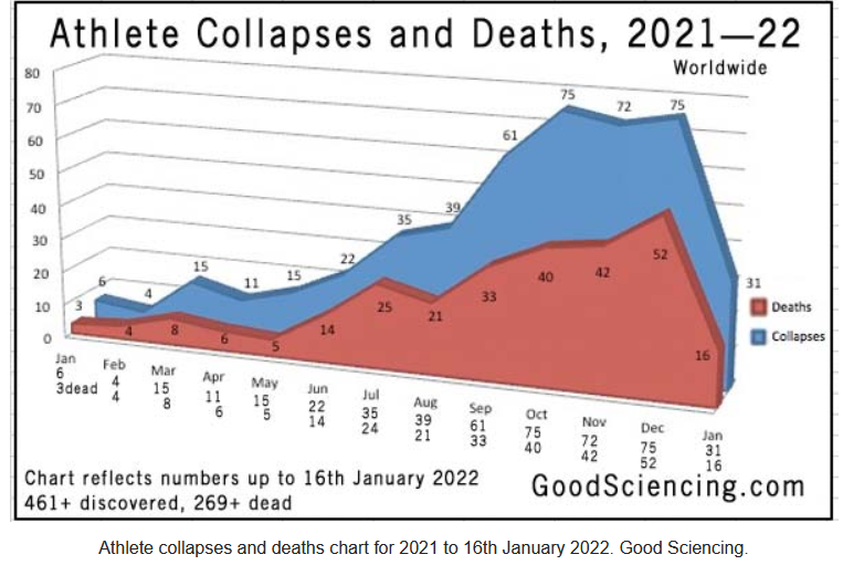 Le Courrier des Stratèges a déjà abordé le sujet des morts subites ou des accidents graves de sportis de haut niveau, professionnels ou amateurs dans un contexte de vaccination massive contre le COVID-19 avec des produits encore expérimentaux. Nous vous indiquons le lien avec une liste quotidiennement mise à jour. On en était le 9 février au soir à 1088 cas recensés