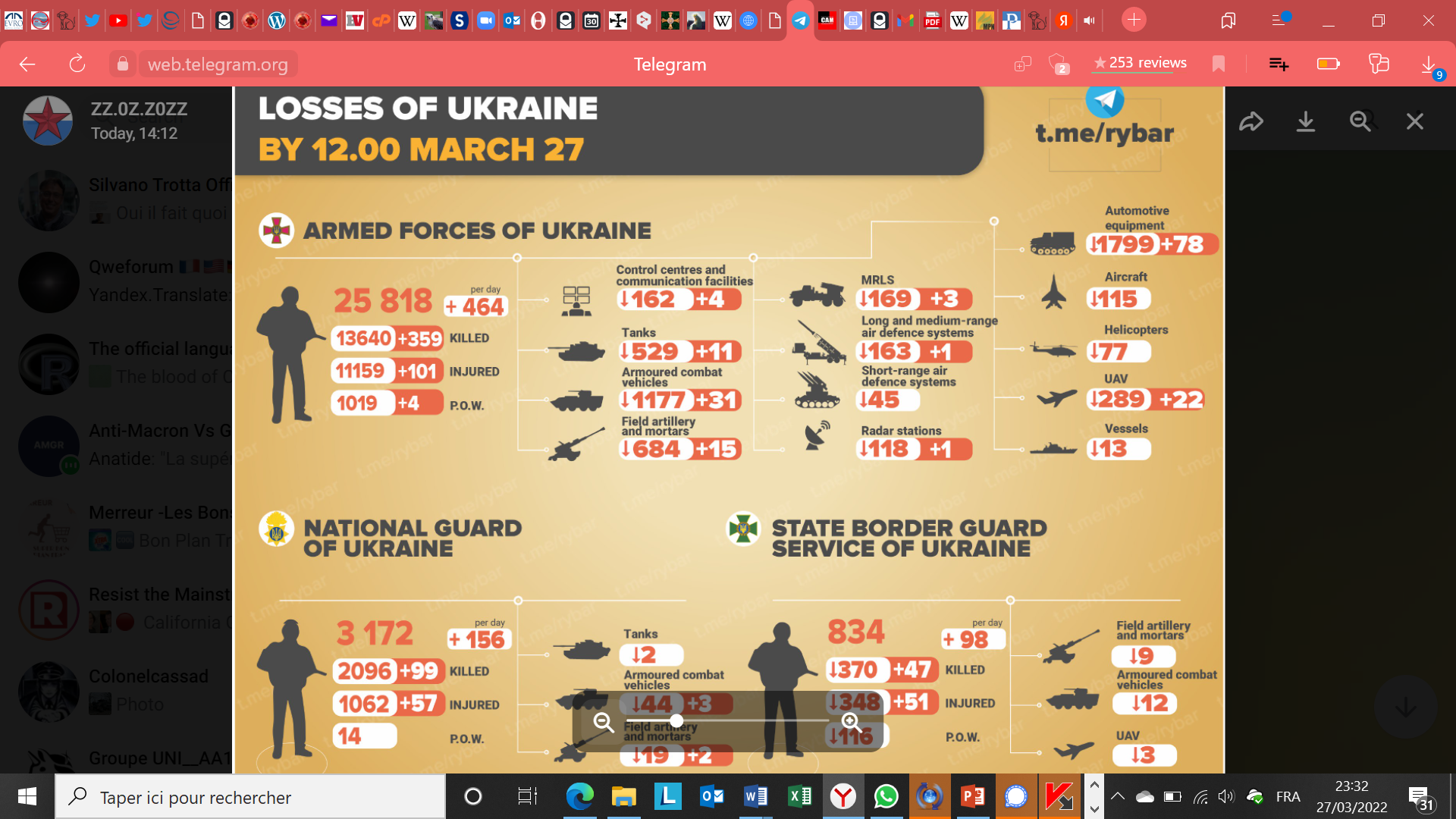 + Comme le montre le tableau ci-dessus, les pertes en hommes et les destructions en matériel de l’armée ukrainienne sont de plus en plus élevées. Du côté russe, quels que soient les chiffres qui circulent sur les réseaux sociaux, nous ne voyons aucune raison de quitter le ratio 1/6 (Russes/Ukrainiens). Les chiffres officiels donnés par l’armée russe le 25 mars montre même une évolution vers 1/7. Ce qui s’expliquerait par l’augmentation des pertes ukrainiennes dues en particulier aux frappes de missiles de précision russes sur des installations de l’armée adverse.