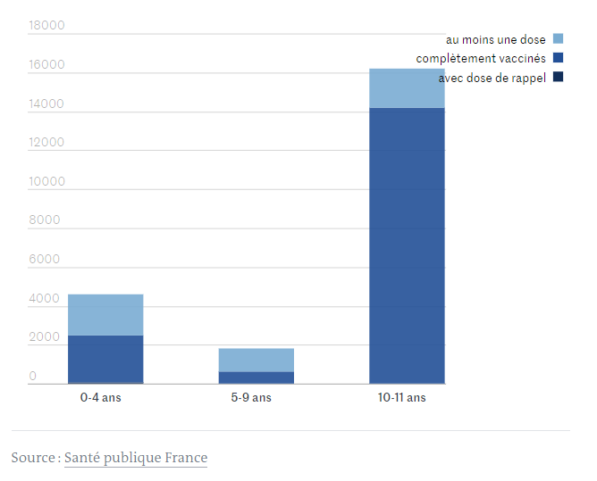 Le chiffre de 17.199 enfants complètement vaccinés et de 22.490 enfants ayant reçu une première dose donne le tournis par rapport au 1.250 enfants de 5 à 11 ans ayant participé aux essais cliniques de PFIZER dans le courant de la même année 2021, selon les données statistiques officielles de Santé Publique France, et ce depuis le mois d’avril 2021, reprises dans l’article du « Monde ». Le journal avance même la date du 27 décembre 2020 pour les deux premières injections sur des tout-petits.