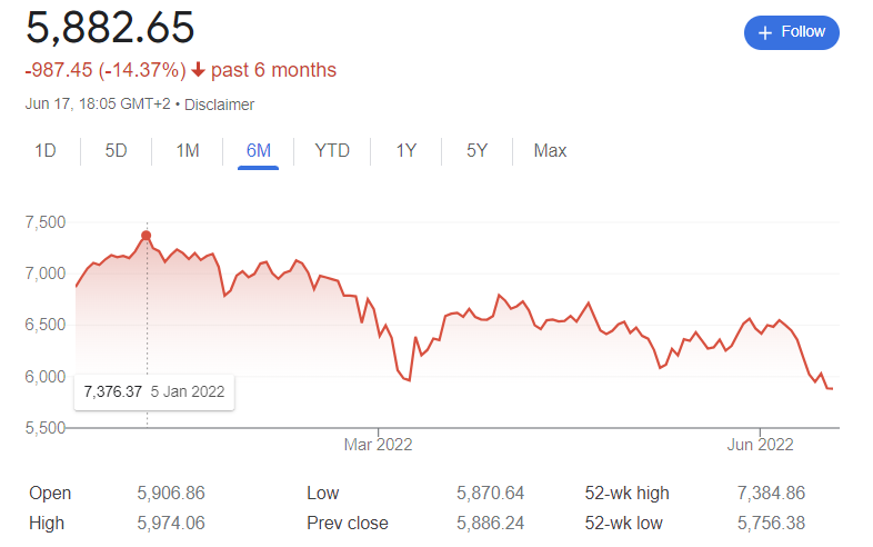 Comme vous le voyez, le CAC 40 avait atteint 7.300 points le 5 janvier 2022. Il flotte aujourd’hui sous les 5.900 points, soit 20% de baisse depuis le pic du 5 janvier.
