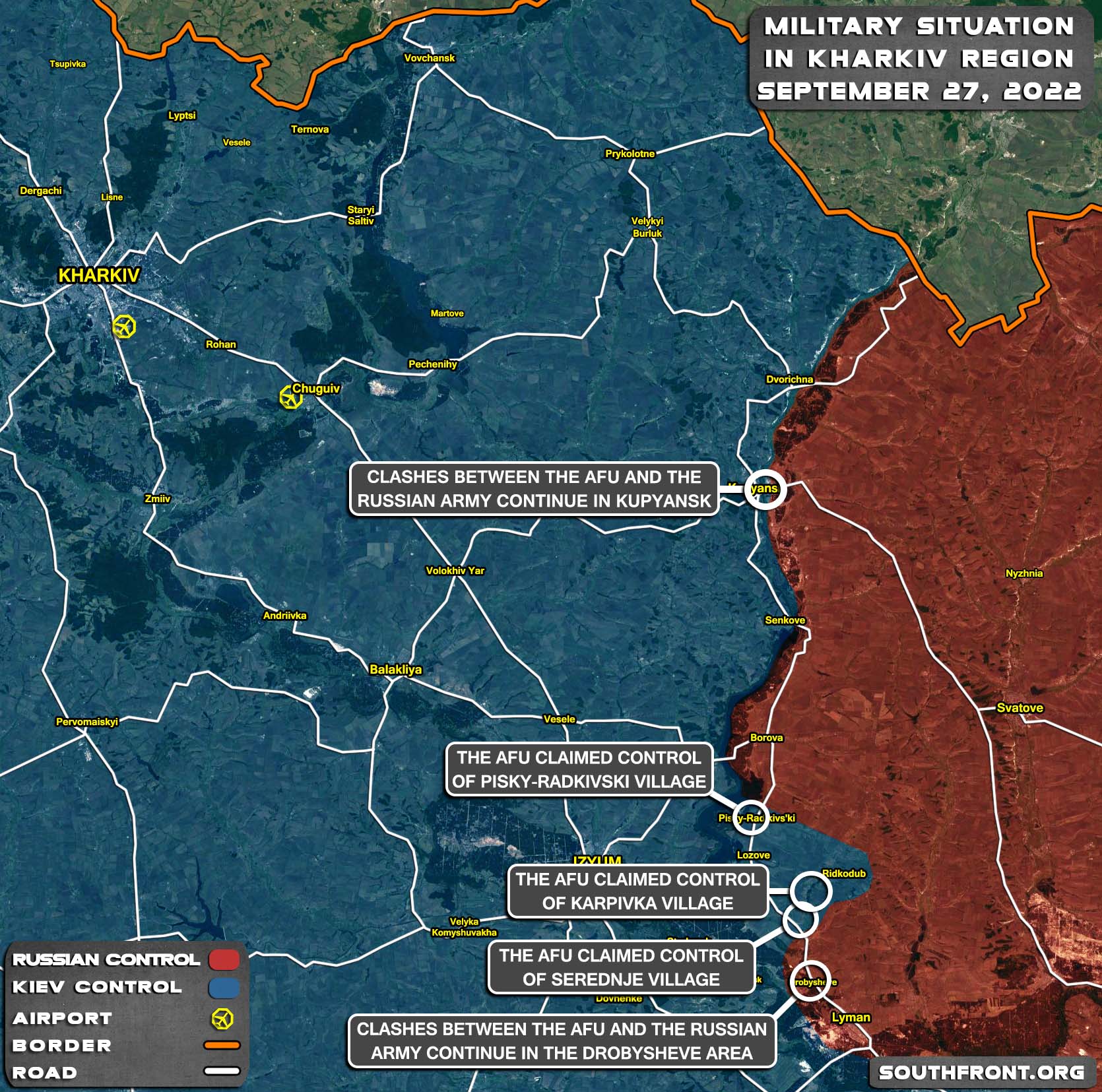 Le 27 septembre, les Kiéviens ont également pris le contrôle du village de Peski-Radkovskie. Les affrontements se poursuivent dans la région. L’armée ukrainienne tente d’atteindre la route Borovaya-Svatovo, située à quelques kilomètres au nord. Si les militaires ukrainiens parviennent à capturer un bastion dans cette zone, cela ouvrira la voie à leur offensive en direction de Svatovo.