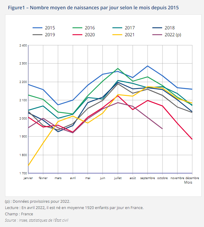 En 2022, la natalité connaît un décrochage historique, avec des chiffres jamais connus jusqu'ici. Cette tendance qui a commencé à s'affirmer en juin 2022, c'est-à-dire 9 mois après l'atteinte des 85% de taux de vaccination dans la population, est devenue catastrophique depuis le mois d'août, c'est-à-dire depuis les premiers effets de la troisième dose. Pour l'instant, l'INSEE ne donne aucune explication à ce trou d'air inquiétant pour l'avenir démographique du pays.
