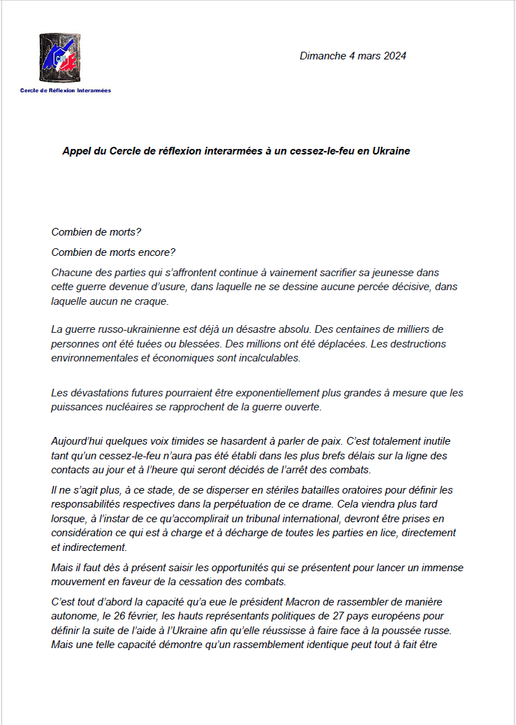Alors que Macron vient de répéter dans la presse tchèque son intention d’envoyer des troupes de l’OTAN pour affronter directement la Russie, des officiers généraux français, rassemblés dans le « Cercle de réflexion interarmées », sauvent l’honneur. Ils lancent un appel ouvert au cessez-le-feu en Ukraine, que nous reproduisons intégralement. Manifestement, les positions extrémistes de Macron (évoquées par ailleurs aujourd’hui par Jacques Myard) sont en train de fracturer l’armée.