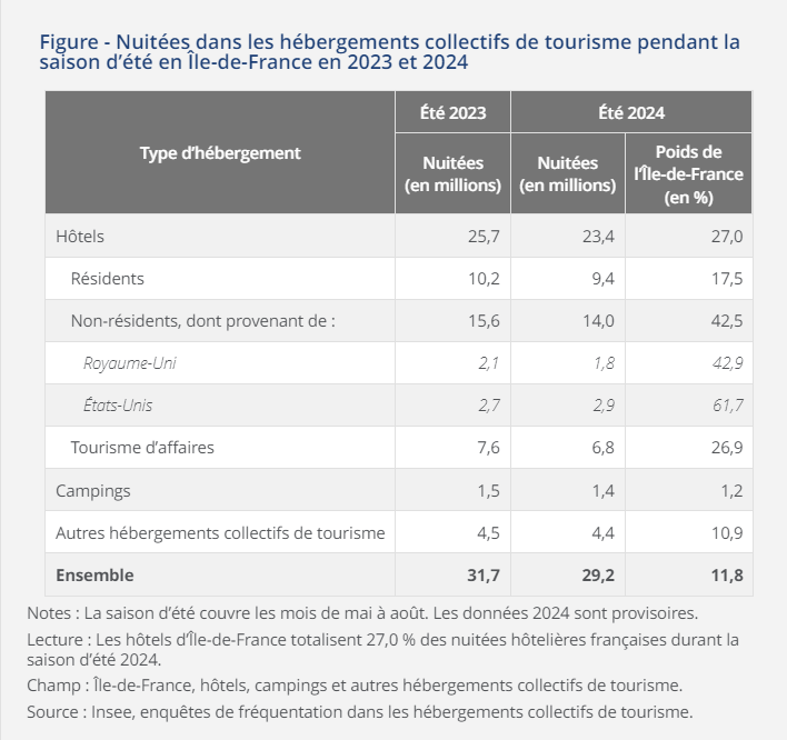 Mais la baisse est bien plus forte en Ile-de-France comme le tableau ci-dessus le montre : les hôtels franciliens ont réalisé 2,3 millions de nuitées en moins entre 2023 et 2024. La baisse concerne autant les résidents que les non-résidents. Seuls les touristes américains sont venus plus nombreux que l’an dernier, ce qui souligne le caractère très « occidental » de ces Jeux.