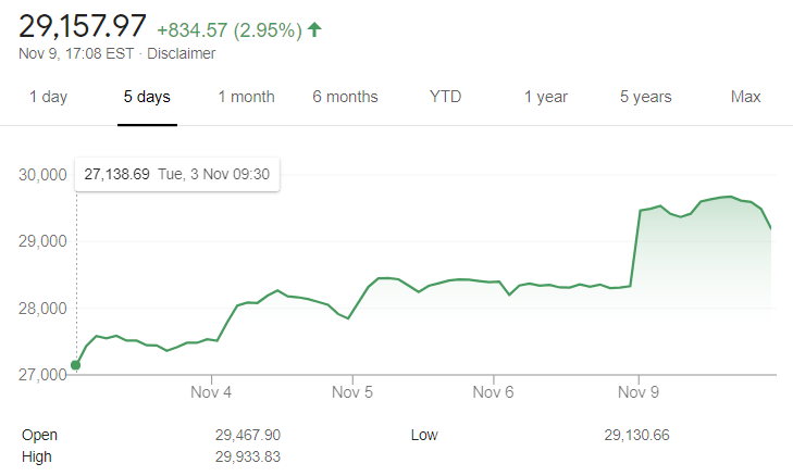 Chronologiquement, l’annonce du vaccin de Pfizer est intervenue juste avant l’ouverture de Wall Street. On lira avec intérêt la dépêche Reuters qui en fait état. Elle a été publiée vers 8 heures 30 du matin aux Etats-Unis, et répercutée en Europe vers 13h30.