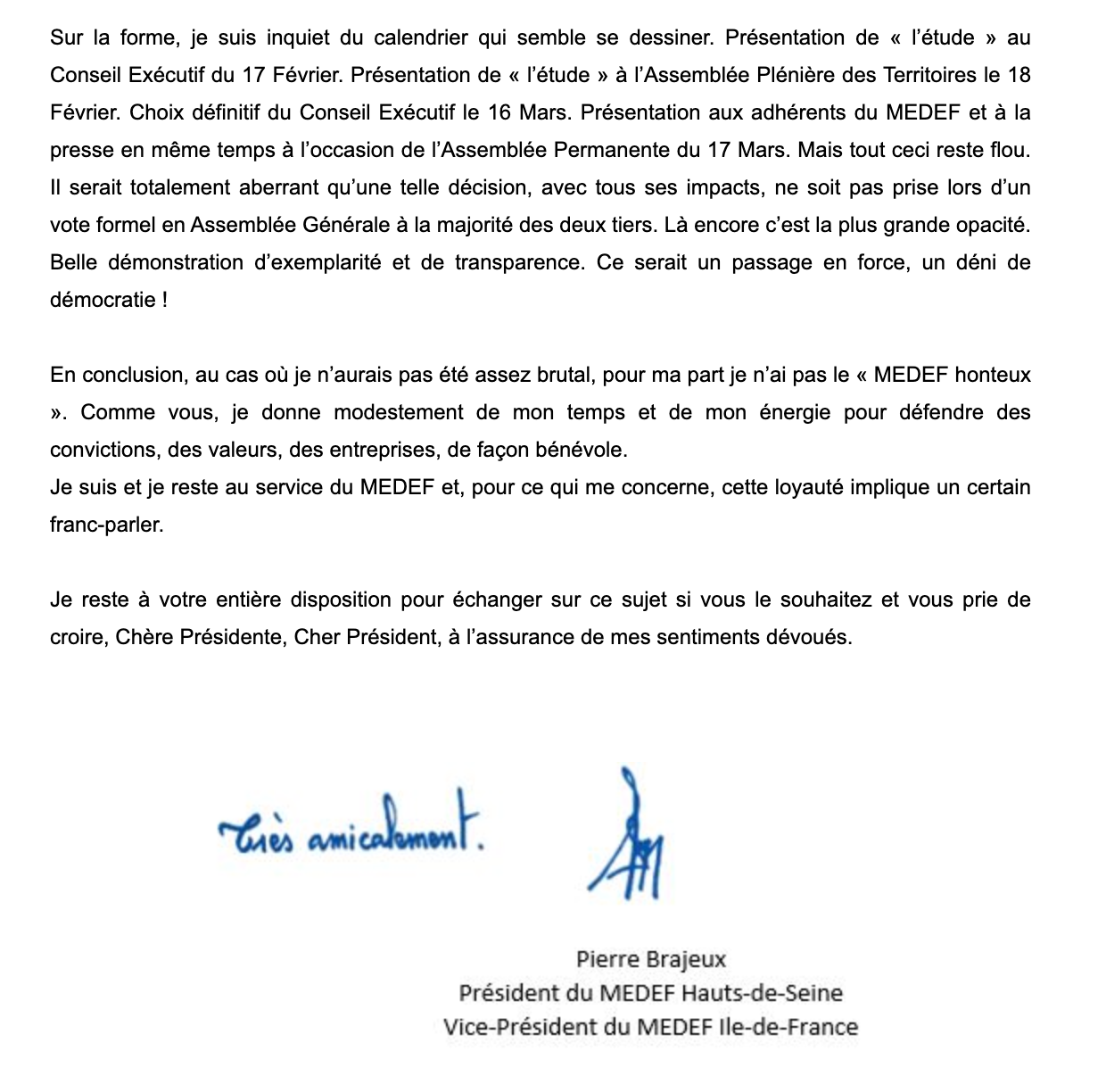 Le MEDEF devrait assez rapidement se retrouver en ébullition. Tout y devient prétexte désormais pour contester une gouvernance beaucoup trop verticale, confiée au maladroit Patrick Martin. Nous publions aujourd'hui un extrait du courrier envoyé par le président du Medef des Hauts-de-Seine sur le changement de nom proposé par l'équipe en place.