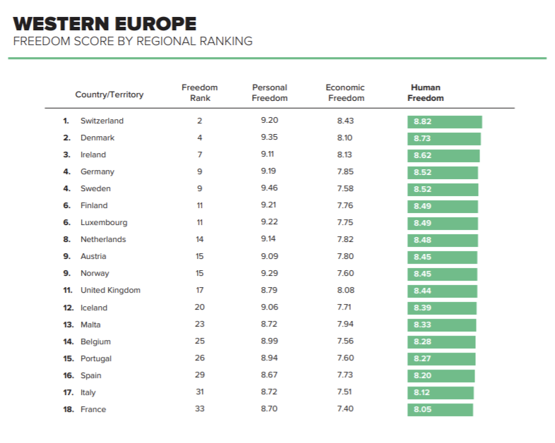 Avec une note de 7,4 sur les libertés économiques, la France a du souci à se faire. L’Albanie, par exemple, réalise une performance de 7,8 sur ce critère, note aussi appliquée à l’Allemagne. La meilleure performance européenne sur ce critère est réalisée par la Suisse, avec une note de 8,43.