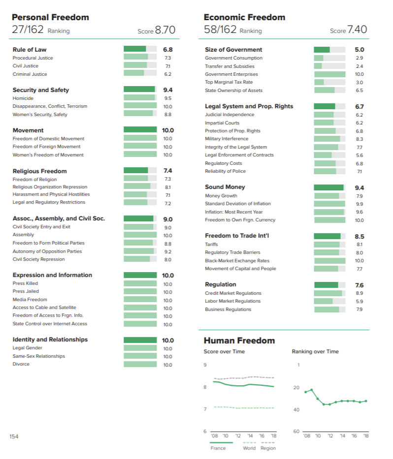 Comme on le voit, l’Index pose un oeil plutôt indulgent sur l’état des libertés publiques en France, mais sombre sur l’état des libertés économiques.