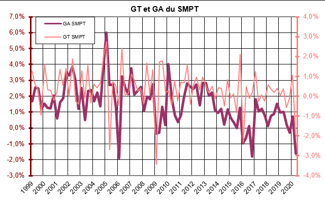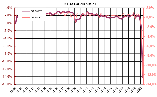 Le graphique ci-dessus illustre le double effondrement qui affecte le salaire moyen par tête : un effondrement en « GA », c’est-à-dire en glissement annuel (autrement dit, on compare le deuxième trimestre de 2020 au deuxième trimestre de 2019), et un effondrement en « GT », c’est-à-dire en glissement trimestriel (on compare le deuxième trimestre 2020 au premier trimestre…). Dans les deux cas, la chute est vertigineuse et dépasse les 12%.