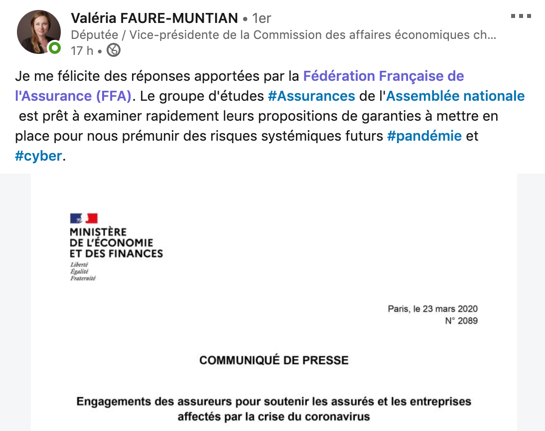 Les députés marcheurs se sont félicités de la survenue de l’accord entre les assureurs et Bercy. La députée Valéria Faure-Muntian a semblé aux anges à l’idée que la profession apporte 200 millions au fonds de solidarité prévu par le gouvernement pour les entreprises en difficulté, assortis de facilité de paiement pour les primes professionnelles.