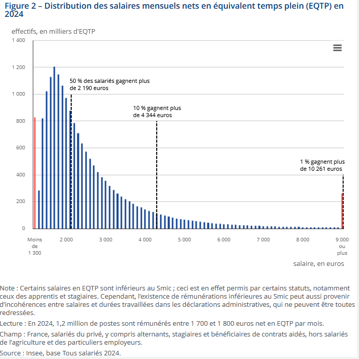 Cependant, cette moyenne reste trompeuse. La moitié des salariés gagne moins de 2 190 euros nets, soit une différence de 543 euros avec le salaire moyen. En bas de l’échelle, un salarié sur dix perçoit moins de 1 492 euros nets, tandis qu’au sommet, 1 % des salariés dépassent les 10 261 euros mensuels. Une fracture béante entre la France des bureaux exécutifs et celle des chaînes logistiques.