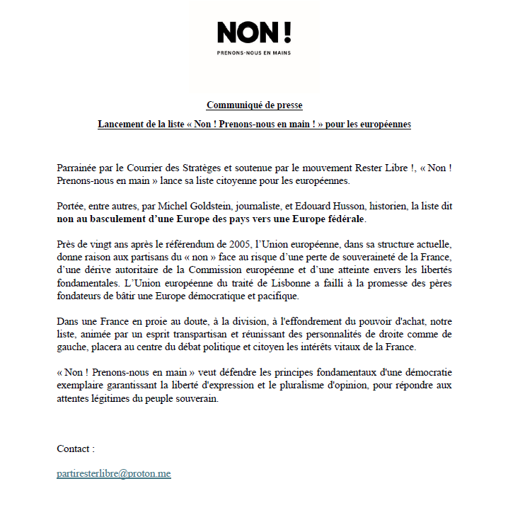 Depuis plusieurs mois maintenant, le Courrier vous annonce qu’il « propulse » une liste aux européennes. Après de nombreuses discussions (qui ne sont pas finies), nous avons jeté les bases d’une liste citoyenne qui regroupera des personnalités civiles de toutes les sensibilités de l’arc politique, dès lors qu’elles sont déterminées à s’opposer à une Europe fédérale. Cette liste sera conduite par Michel Goldstein, proche de Renaissance, et épaulée par Edouard Husson, bien connu de nos lecteurs. D’autres sensibilités devraient rejoindre rapidement cet ensemble. En voici le communiqué de presse…