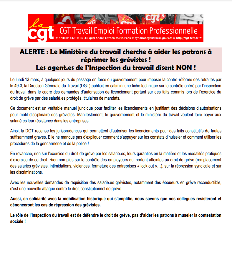 Nous avons évoqué les arrestations illégales qui ont commencé dans les rues de Paris à l’encontre de passants considérés comme manifestants non déclarés dans les rues, dans des conditions qui font l’objet, désormais, de très sévères critiques sur leur intention réelle (dissuader les manifestations et ficher des citoyens passés entre les mailles de la surveillance généralisée). Parallèlement, certains employeurs auraient la tentation de prêter leur concours à une sévère répression anti-syndicale… avec le soutien du ministère du Travail. Face à ces abus qui détournent les moyens de l’Etat au profit de la caste, la bureaucratie commence à se rebeller. La lâchage du Président de la République par l’appareil de pouvoir a commencé.
