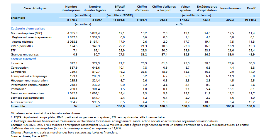 Avec 5,2 millions d'entreprises marchandes non agricoles et non financières, la France compte 97 % de microentreprises, mais ces dernières ne pèsent que 19 % de la valeur ajoutée et 17 % des emplois.
