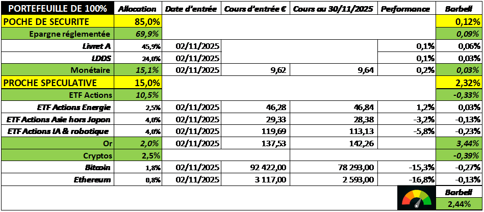 Fin de partie. Le premier mois de l'application concrète de la Barbell Strategy est écoulé, et le verdict est sans appel : cette méthode n'est pas une théorie pour salon feutré, mais une arme de destruction massive contre la médiocrité financière !