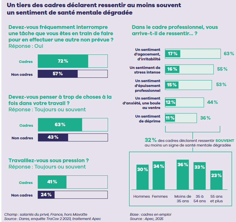 L'analyse de l'Apec révèle des disparités qui soulignent des vulnérabilités spécifiques. Les femmes (34 % touchées contre 30 % des hommes) et les moins de 35 ans (35 % avec un signe de santé mentale dégradée) sont les plus exposés.