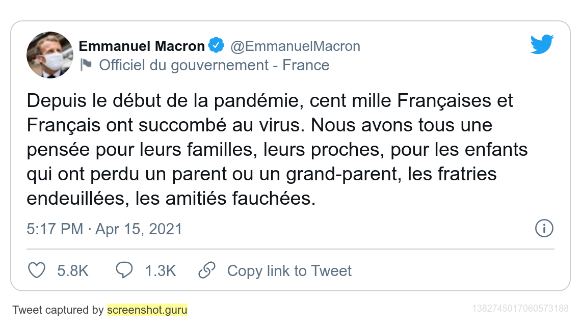 Enfin, il y a eu le tweet du début de soirée, celui qui a fait bondir beaucoup d’internautes sur les réseaux sociaux, consacré aux 100 000 Français. Il est en fait en deux parties, puisque ce que nous reproduisons plus haut est suivi du texte: « Et si toute notre énergie est aujourd’hui tournée vers la sortie de cette épreuve, nous n’oublierons aucun visage, aucun nom. »