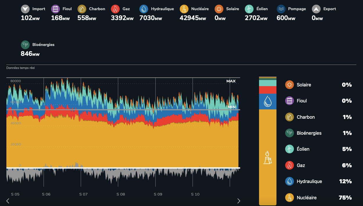 Ainsi, en cet fin d’hiver 2021, du 1° février au 16 mars, 75% de l’électricité provenait du nucléaire, 12% de l’hydraulique, 6% du gaz et 5% de l’éolien.
