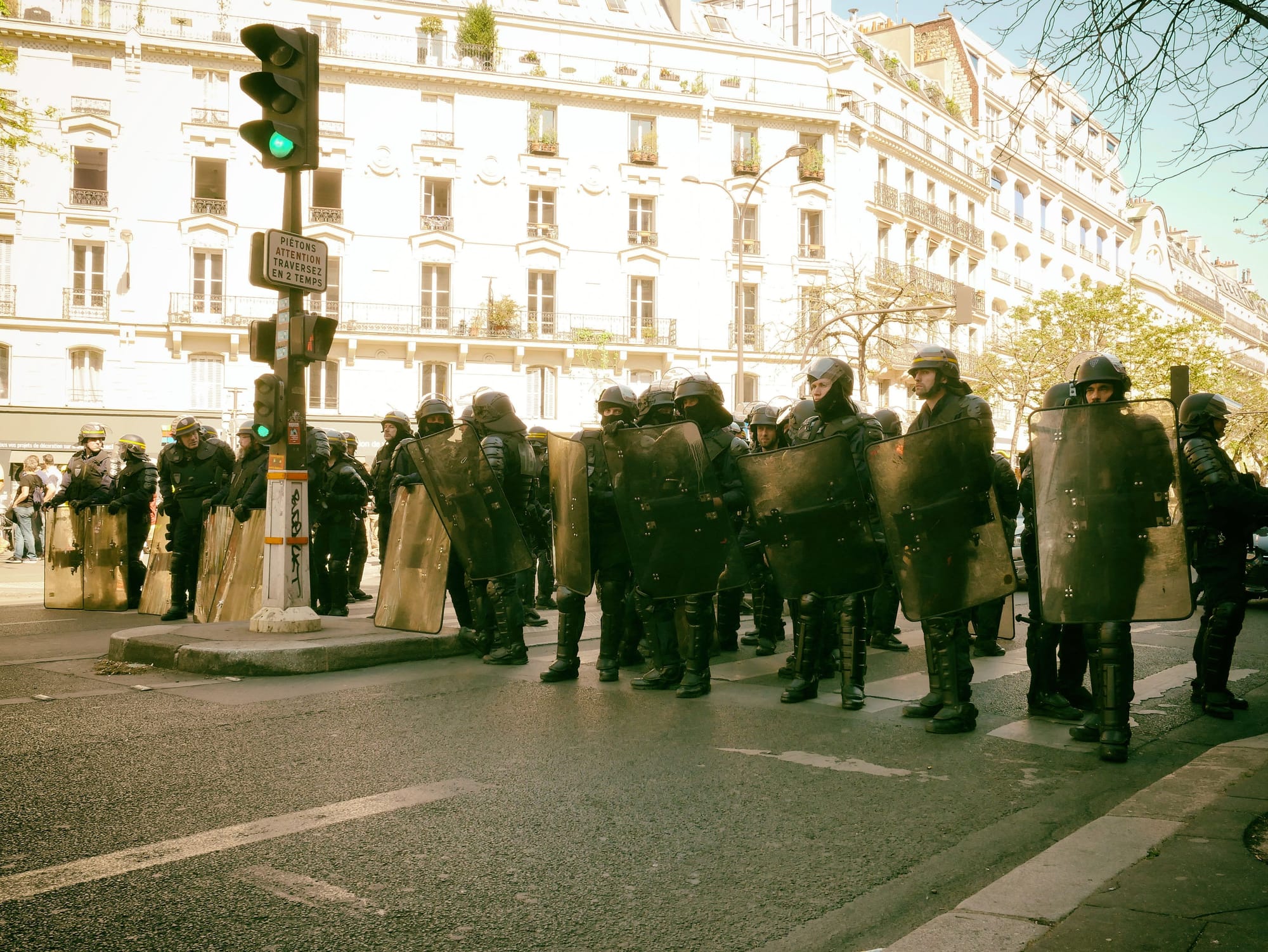 Selon une technique désormais consommée, le Préfet de Police a généralisé une organisation redoutable: les manifestants sont entourés par un cordon sanitaire qui ne peut être franchi qu’après un contrôle des sacs. Cette technique empêche les manifestants de sortir de la manifestation pour aller chercher du matériel de destruction, et empêchent les black blocks de rejoindre le cortège avec des objets susceptibles de se transformer en armement.