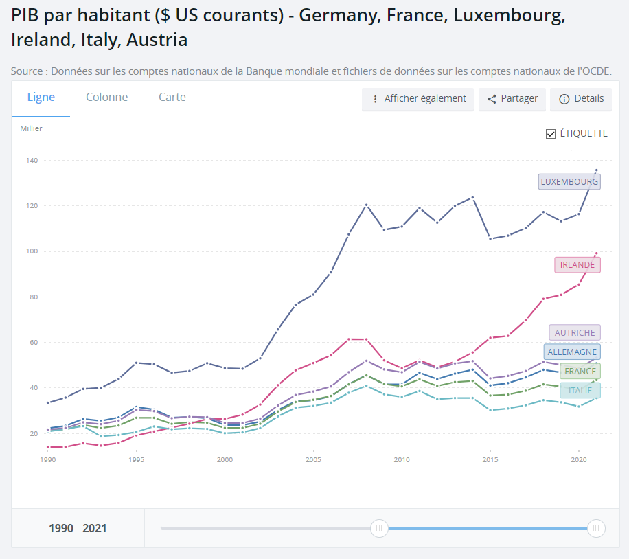 Le pays européen le plus riche, et de loin, est le Luxembourg, qui est aussi l’un des rares pays de l’Union à avoir connu un « recovery » en 2021 qui lui permet de « battre un record de PIB ».