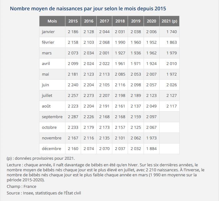 Selon l’INSEE, à partir du mois de juillet, la balance se rééquilibre et les chiffres rejoignent ceux connus en 2020 pour ensuite s’intensifier au cours du mois d’aout avec 3% en plus (ce qui fait en principe 2 120 naissances quotidiennes). Enfin, de janvier à aout 2021, on est à nouveau face à une baisse de 2% ce qui fait une moyenne de 1 980 bébés par jour.