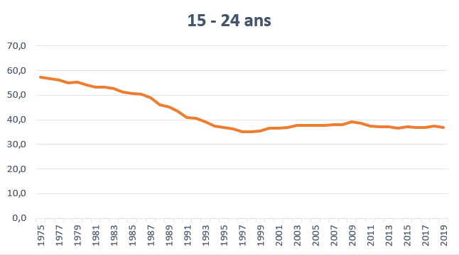 Le point le plus marquant dans l’évolution de la population active depuis 1975 tient à l’emploi des jeunes. En 1975, 60% des 15 à 24 ans étaient en situation d’emploi. Cette proportion est passée sous la barre des 50% en 1987, puis sous la barre des 40% en 1991. Depuis cette époque, elle stagne autour de 38%.