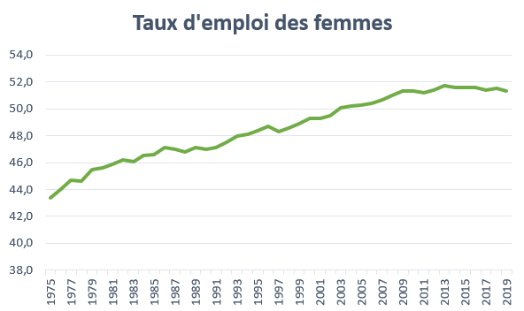 Ainsi, elles étaient 43% en 1975 à exercer une activité ou à être au chômage. Après avoir atteint un pic de près de 52% (soit un gain de 9 points) en 2013, le taux d’emploi des femmes s’est légèrement replié depuis lors et flotte autour des 51,5% depuis les années 2010.