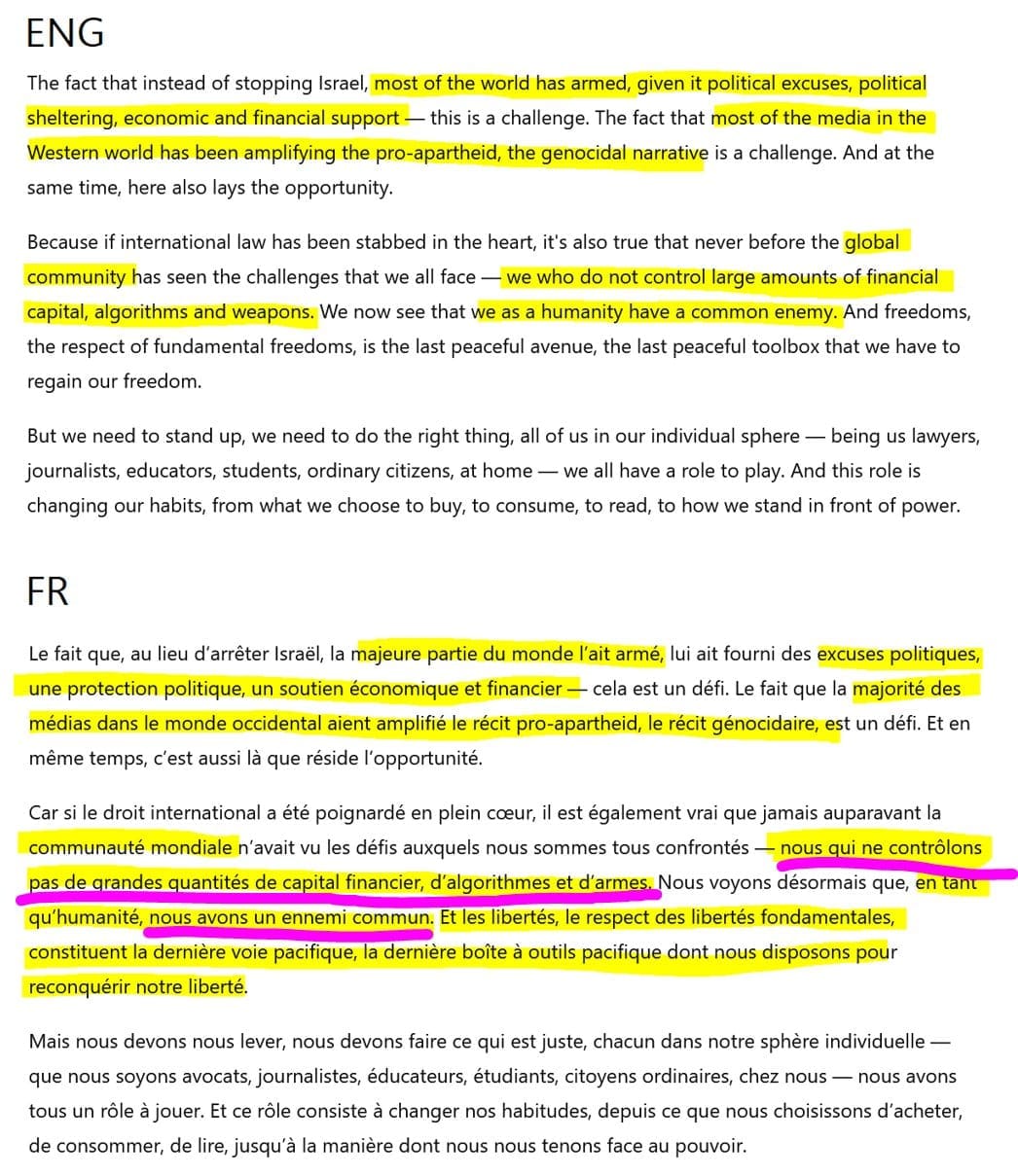 Les mots exacts d’Albanese, dans une intervention en visioconférence lors d'un forum à Doha organisé par la chaîne Al Jazeera, étaient les suivants : « Nous qui ne contrôlons pas de vastes capitaux financiers, ni les algorithmes ni les armes, constatons désormais qu’en tant qu’humanité, nous avons un ennemi commun. » Elle évoquait un « génocide » à Gaza rendu possible par l’armement et le soutien politique et économique international à Israël.