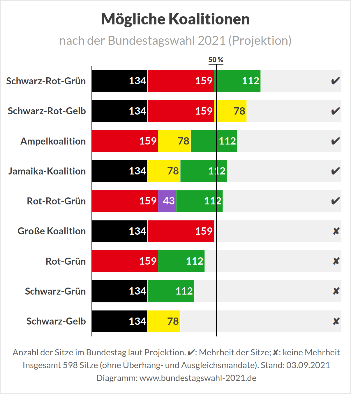 Venons-en maintenant aux coalitions possibles. L’AfD étant par principe exclue des coalitions de gouvernement, il reste donc en réalité trois configurations envisageables, toutes à trois partenaires. Les Verts, compte tenu de la faiblesse relative de la FDP, sont nécessairement promis au second rôle : Annalena devrait occuper le strapontin de vice-chancelière. Le couple SPD/Verts aurait, en l’état actuel des sondages, la possibilité de s’allier avec la FDP (Rouge-Vert-Jaune, majorité confortable à plus de 55%), mais aussi avec « Die Linke » (Rouge-Vert-Rouge, majorité plus courte). Il va sans dire que la deuxième solution ne soulève pas un enthousiasme délirant au sein du Mittelstand. Le couple Union/Verts n’aurait d’autre choix que de s’allier avec la FDP (Noir-Vert-Jaune, majorité confortable, également à plus de 55%). Dans les deux configurations avec les Verts et la FDP, la conclusion d’un accord de coalition et la cohabitation des deux formations ne va pas manquer de piquant, du fait de leurs très nombreux points de désaccord. Il faut donc s’attendre à des négociations longues et pénibles.