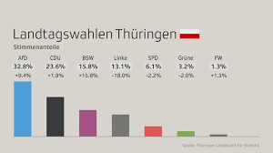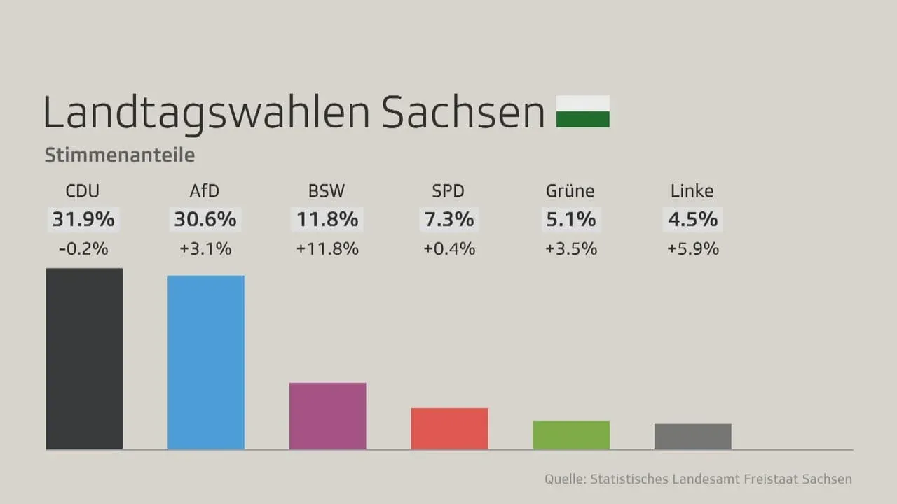 Voici les pourcentages obtenus par les différents partis allemands lors des élections régionales en Saxe et en Thuringe. On remarque une stabilité des chrétiens-démocrates (CDU); une érosion du parti du Chancelier Scholz (SPD, sociaux-démocrates); une chute des Verts, deuxième partie de la coalition; une disparition des Libéraux, troisième partenaire de la coalition. Une grande volatilité de la Gauche (die Linke)