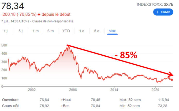 Depuis la crise des subprimes en 2007, les banques de la zone euro sont en apparence plus stables, ayant effectué d’importants efforts d’assainissement de leurs bilans, notamment sous la pression des règles internationales du Comité de Bâle. En réalité, la politique de ZIRP (Zero Interest Rate Policy, que nous vous expliquons dans un article de notre mensuel sur abonnement Finance & Tic) les a rendues moins rentables que leurs concurrentes américaines et asiatiques (de l’ordre de 3 à 5 pts de %), mais surtout, et c’est flagrant, que leurs homologues européennes hors zone euro (Royaume-Uni, Suède). L’indice des banques de la zone euro (voir graphique du SX7E) a ainsi dévissé de 85% depuis 2007. Or, sans un secteur bancaire solide et viable, ni des monnaies nationales plus stables susceptibles d’attirer les investisseurs du monde entier, aucun des défis du continent européen ne pourra être relevé, au moment même où les besoins de transformation, notamment ceux liés à la crise énergétique, sont pourtant les plus pressants.