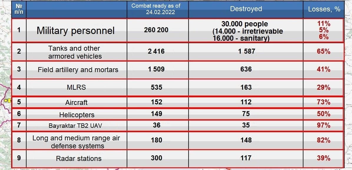 L’armée de l’air ukrainienne et le système de défense aérienne ont été presque entièrement détruits, la marine du pays a cessé d’exister ;