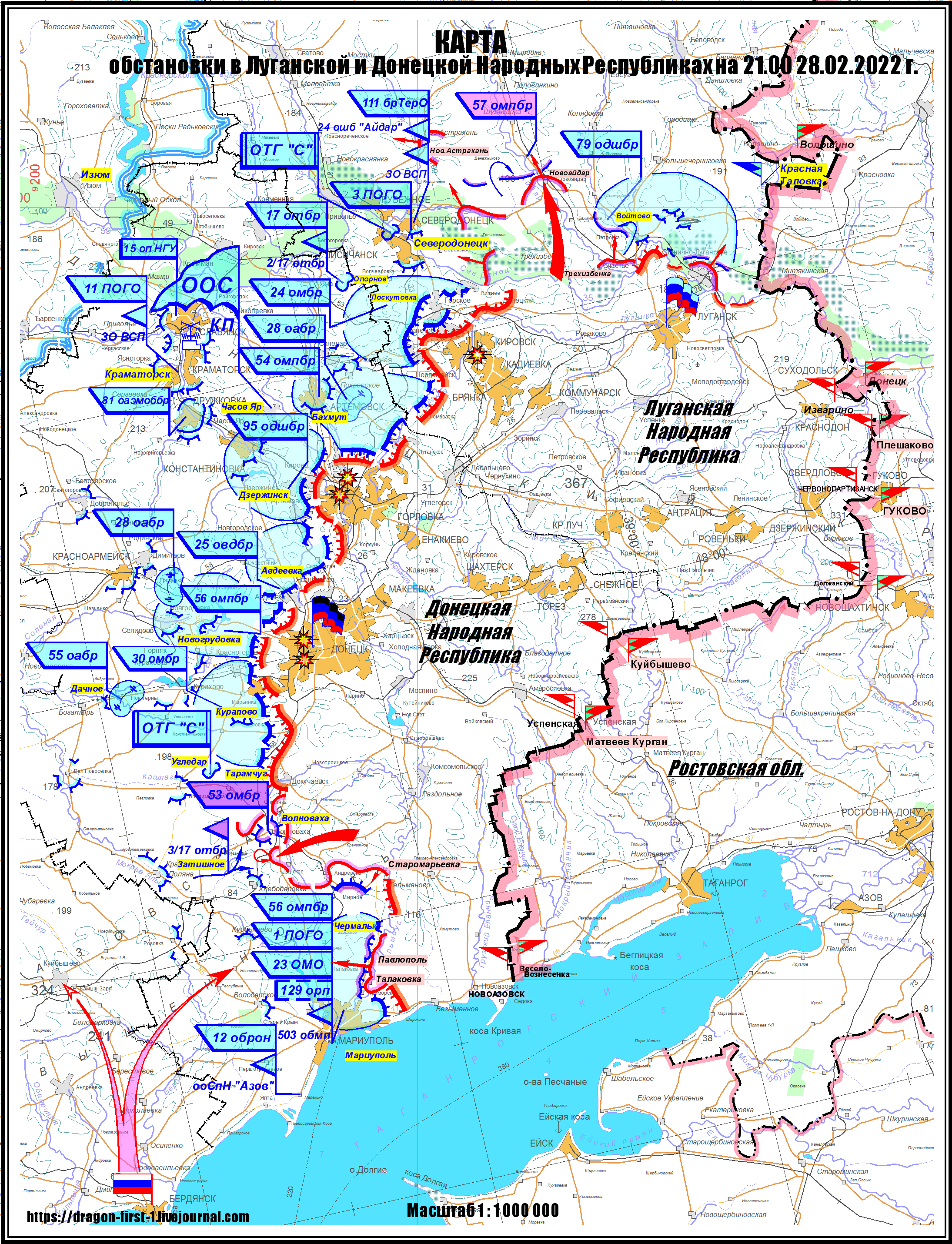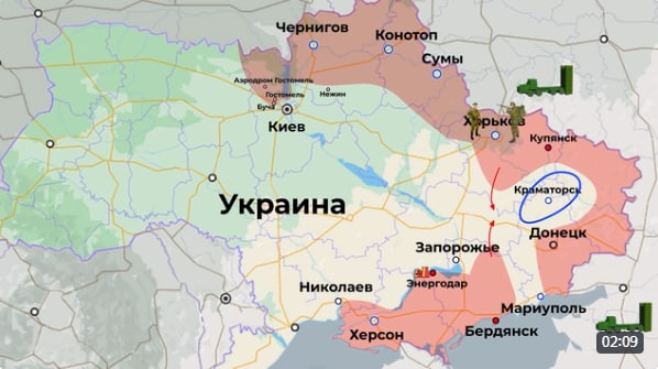 « Un cartographe Russe réputé publie une carte du front LDNR datée d’hier soir. Elle montre des succès très limités vers le nord, aucun vers Kramatorsk/Slaviansk (nord-ouest), contrairement à l’impression qu’on pouvait avoir des rapports de combats. Elle montre l’approche sur Severodonetsk (nord-ouest), le quasi-encerclement de Volnovakha au centre-ouest, le développement de l’encerclement de Marioupol au sud-ouest (avec l’arrivée des troupes Russes par la Crimée/Berdyansk dans le dos). Belle carte très honnête » C’est la guerre ! Les Russes ne font pas comme les Américains qui bombardent massivement avant de risquer leurs soldats. Ils vont sur le terrain. Et c’est dur car l’armée ukrainienne a été armée par l’OTAN et fanatisée par les fascistes ukrainiens (Bataillon Azov, Voie Droite etc…) depuis vingt ans.