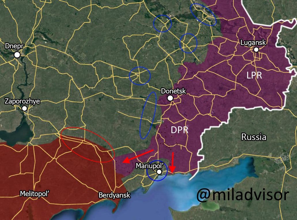 L’étau se resserre sur Marioupol qui est encerclée par la jonction des troupes russes et des troupes des républiques sécessionnistes comme le montre cette carte de Military Advisor: