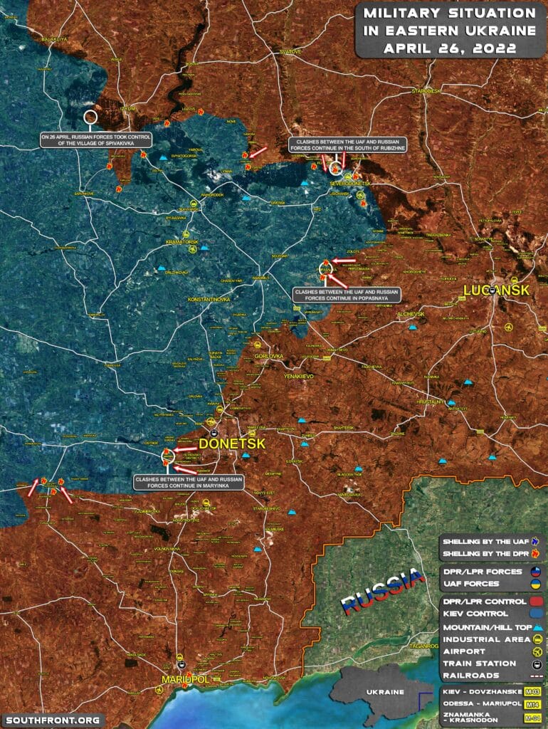 Pendant ce temps, sur les lignes de front, les forces russes avancent lentement dans différentes directions. Les troupes conjointes russes et de la République populaire de Lougansk repoussent l’Armée ukrainienne au sud d’Izioum et près de Velikaya Novoselka. Le renforcement des forces russes dans cette zone se poursuit, de sorte qu’un assaut majeur dans cette zone est probablement à venir.