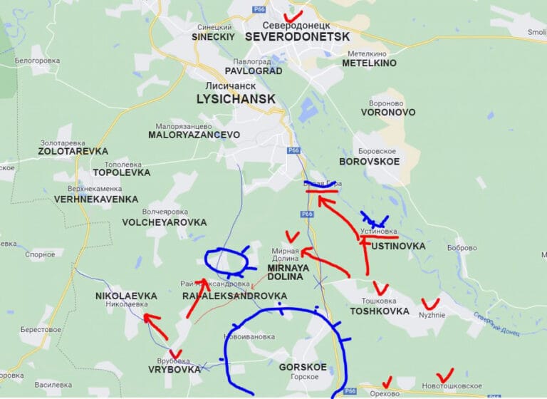 Les combats se poursuivent actuellement vers Belaïa Gora et Voltcheïarovka, au sud-ouest de Lissitchansk, afin de couper l’autoroute qui permet de sortir de la ville. Plus au sud-ouest, les forces alliées ne sont plus qu’à 7 km d’Artiomovsk (Bakhmout).