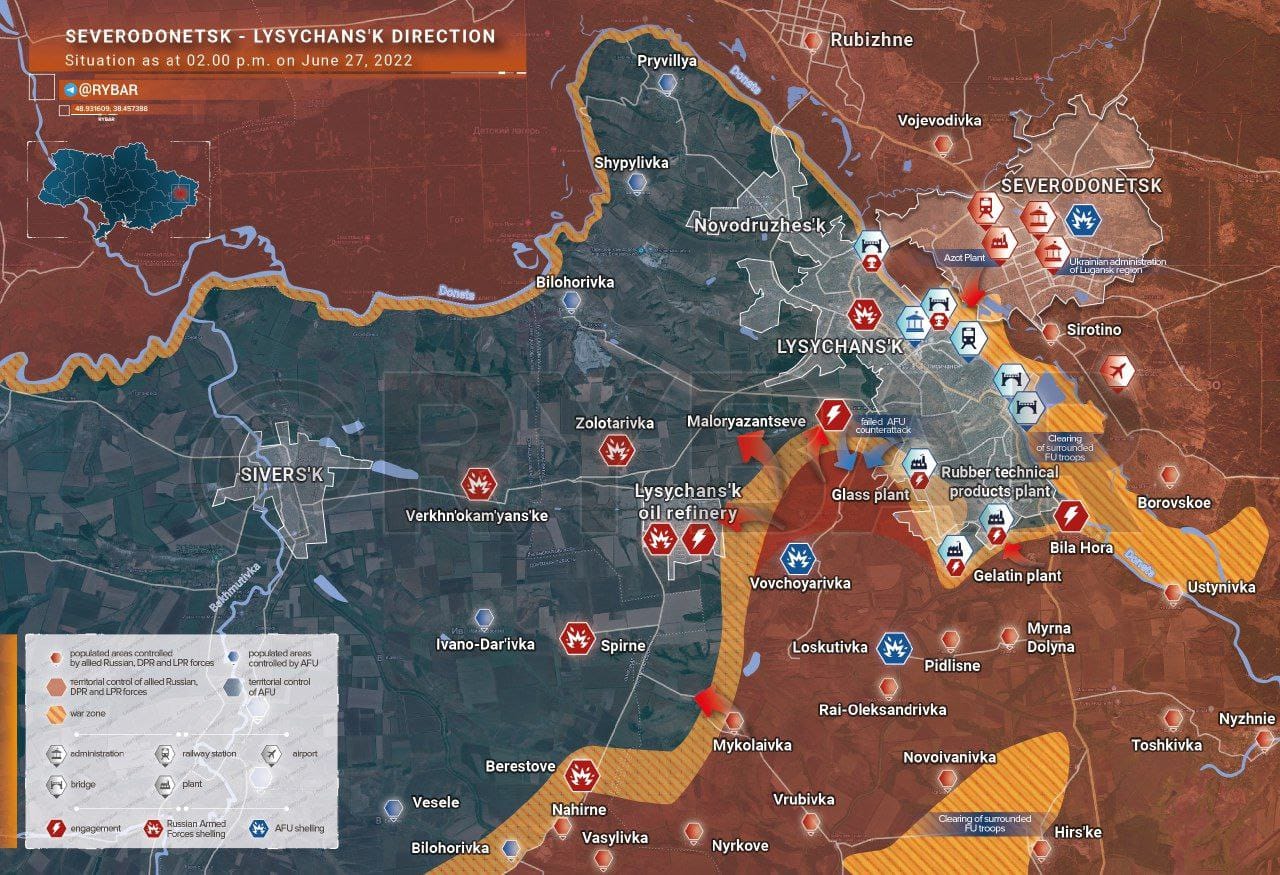 ▪️.Des unités d’assaut des forces armées russes, soutenues par l’aviation, ont percé les défenses kiéviennes à l’ouest de Volcheïarovka et occupé une partie du territoire de la raffinerie de Lisitchansk. Des combats ont lieu dans la partie ouest de la raffinerie et dans le village de Verkhnekamenka avec des unités des 25e, 24e et 17e brigades de l’armée ukrainienne.