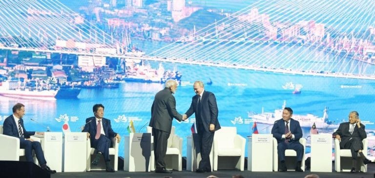La toile de fond n’aurait pas pu être plus spectaculaire, puisque le président russe Vladimir Poutine et le président de l’Assemblée populaire nationale de Chine Li Zhanshu écoutaient Modi sur le podium à Vladivostok.