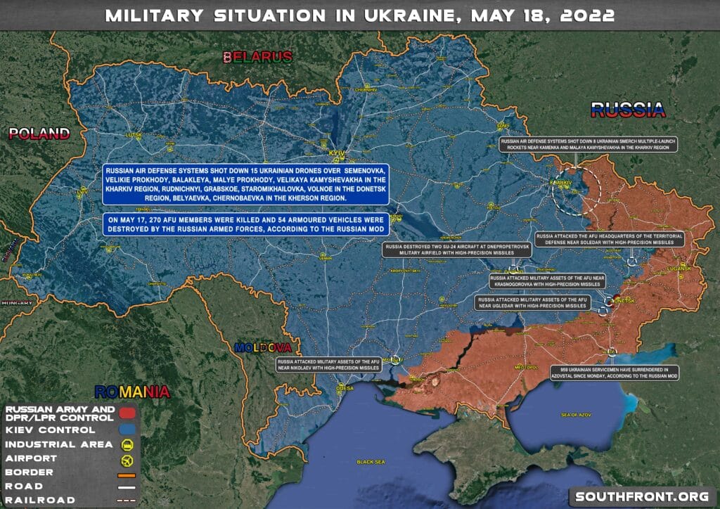 + L’avancée de l’armée ukrainienne dans la région de Kharkov est arrêtée. Des unités de défense territoriale sont transférées dans les localités de Pokrovka, Grabovskoïe, Slavgorod et Popovka dans la région de Soumy. Autant dire que l’armée russe se montre rusée, comme depuis le début: avec son principe de « défense élastique », (1)elle fixe des troupes ukrainiennes dans le nord du pays, qui ne sont pas utilisées dans le Donbass; (2) elle attire l’armée ukrainienne en rase campagne et en fait une cible pour l’artillerie russe