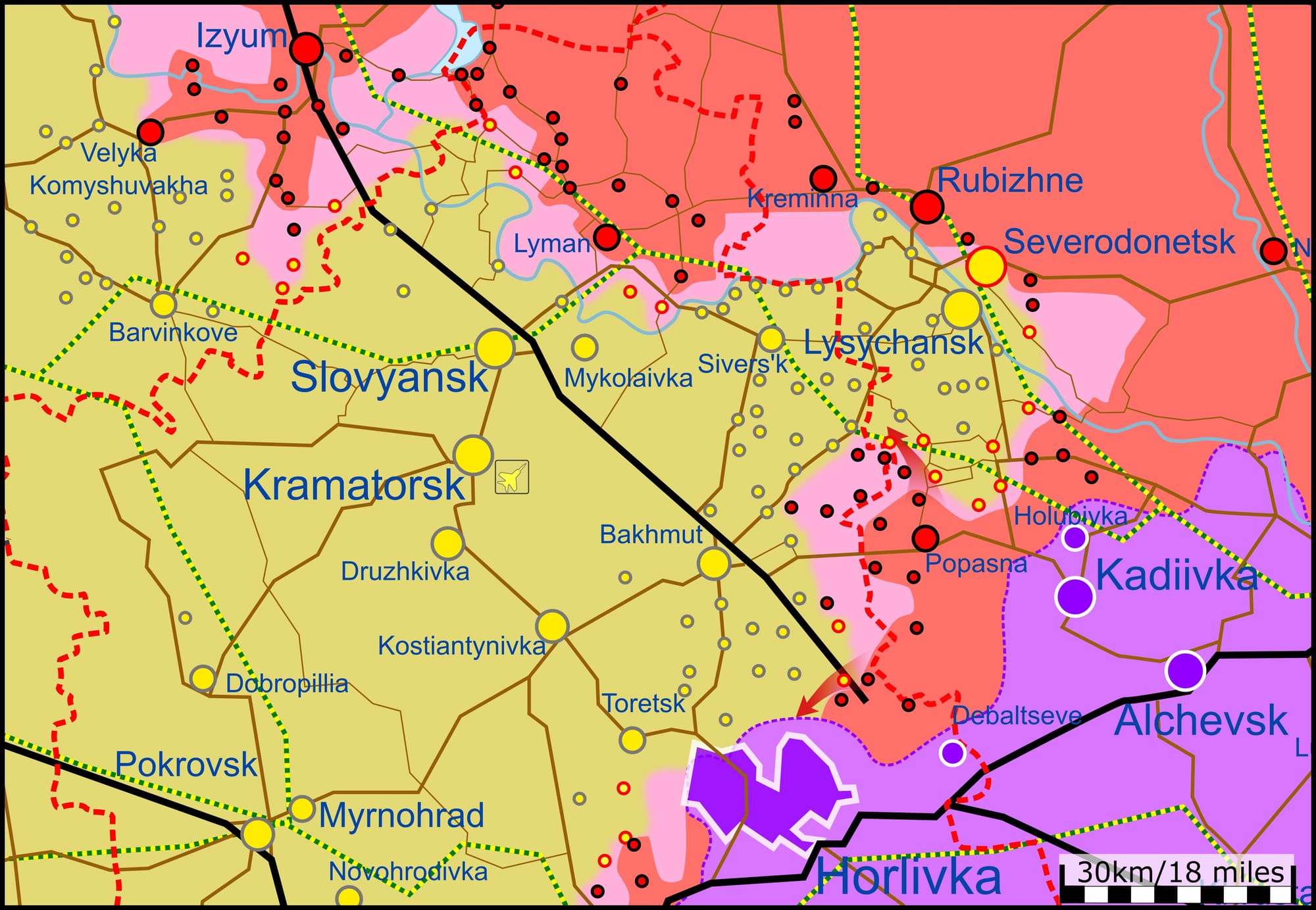 Après que la ville de Krasni Liman est passée sous le contrôle de la République Populaire de Donetsk, les forces dirigées par les Russes poursuivent leur avancée vers Slaviansk depuis l’est. Les positions de l’armée ukrainienne dans le village de Raïgorodok situé à 10 kilomètres de Slaviansk sont déjà bombardées par l’artillerie russe. L’avancée russe menace le ravitaillement militaire des unités de l’armée ukrainienne déployées dans la région métropolitaine de Severodonetsk-Lisichansk depuis Slaviansk et Seversk.