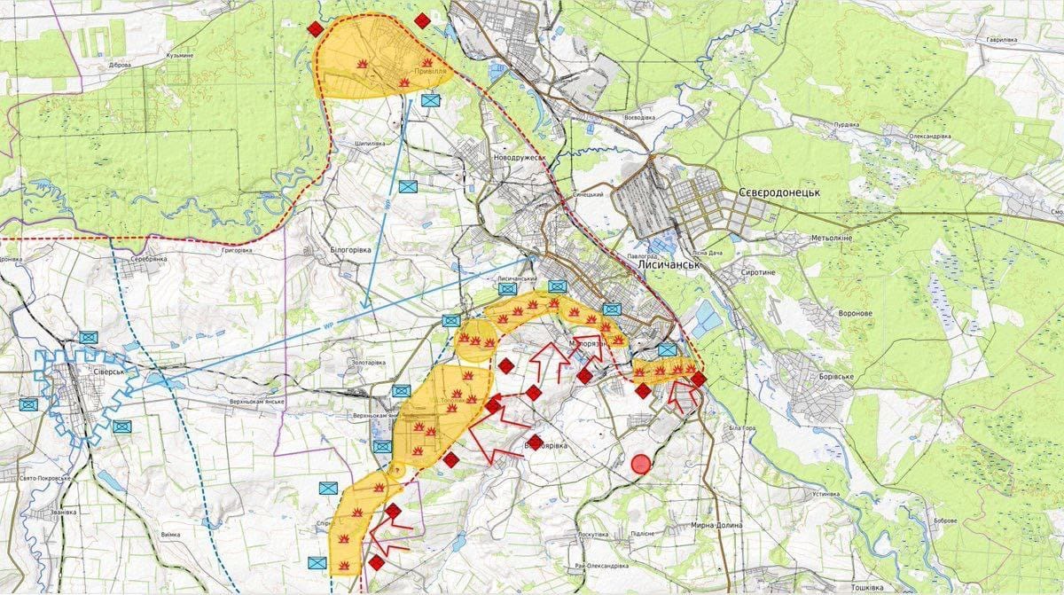 + La prise de contrôle de la raffinerie de pétrole de Lisitchansk est terminée. Les unités ukrainiennes se sont retirées à Zolotarivka et tentent de se retrancher le long de la dernière route de retraite de Lisitchansk. À l’ouest de la ville, les forces alliées avancent sur Seversk depuis deux directions : de la raffinerie de pétrole à Verhnokamïanskïe et de Nikolaivka à Spirne. Les combats se poursuivent à la périphérie sud de Lisitchansk, près de l’usine de produits en caoutchouc et de Bila Hora.