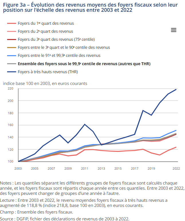 Lisons entre les lignes de ce rapport. L'INSEE nous apprend qu'entre 2003 et 2022, le fossé entre les ultra-riches (le top 0,1 %) et le peuple ne s'est pas contenté de se creuser : il a changé de nature. L'écart de revenus avec les plus modestes est passé de 95 fois à 167 fois. Ce n'est plus une inégalité, c'est un changement d'espèce.