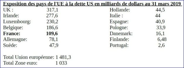 En clair, en cas de crise économique, monétaire et/ou boursière, partant des USA, c’est l’UE qui se trouverait la plus exposée, après les USA, aux conséquences immédiates d’un effondrement du dollar, de la bourse et/ou de l’économie US.