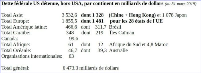 Notons aussi que les paradis fiscaux (Îles Caïmans par exemple) regorgent de dettes US. Le blanchiment d’argent et la corruption se portent donc toujours très bien dans le monde.