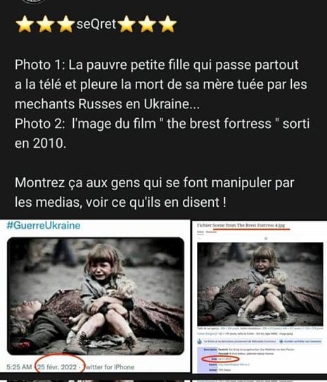 Comme celle de la petite fille ukrainienne sur Twitter, pleurant la mort de sa mère dans ce contexte conflictuel. En effet, les internautes ont réussi à prouver que cette photo très médiatisée n’est, en fait, qu’une image tirée du film « the brest fortress » qui est sorti au cours de l’année 2010.