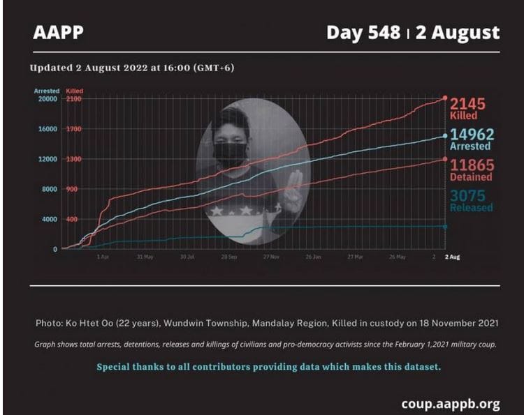 Selon l’Association d’assistance aux prisonniers politiques (AAPP), depuis que le régime militaire a pris le pouvoir, la junte aurait tué plus de 2.100 individus. De nombreuses arrestations ont aussi eu lieu à Myanmar. Plus de 14.800 personnes ont été inculpées et condamnées.