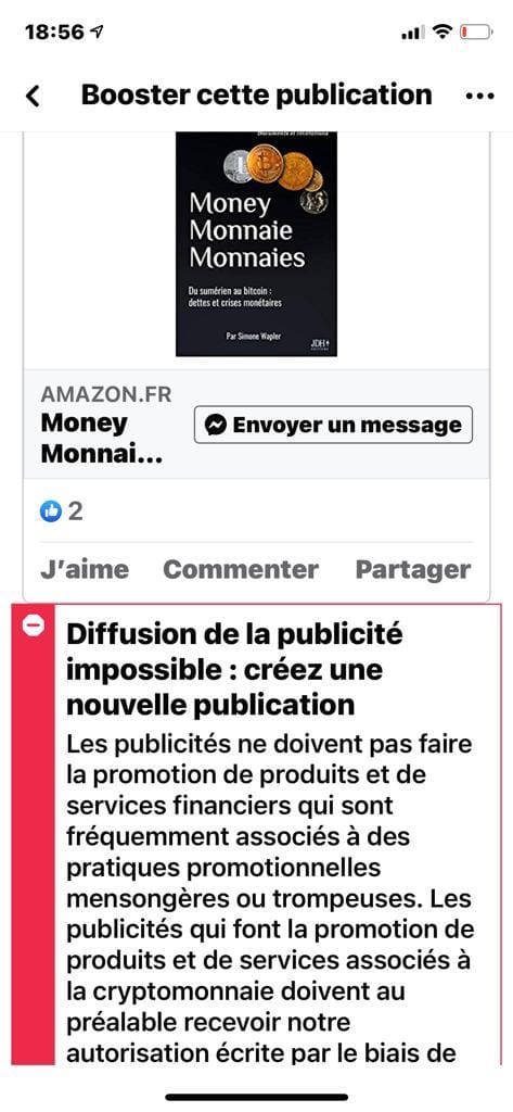 Dans le cas de mon livre, Facebook a justifié sa fin de non-recevoir par la référence aux cryptomonnaies.